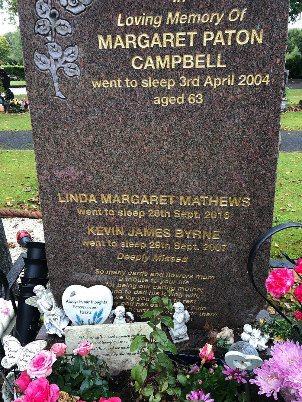 Find a Grave, database and images (https://www.findagrave.com/memorial/214614740/linda-margaret-mathews : accessed 15 July 2022), memorial page for Linda Margaret Campbell Mathews (16 Oct 1961–28 Sep 2016), Find a Grave Memorial ID 214614740, citing Adambrae Cemetery, Livingston, West Lothian, Scotland ; Maintained by Mike (contributor 50522871) .