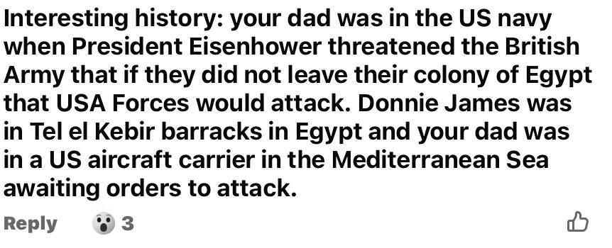 Interesting history: your dad (Derry Roberts) was in the US navy when President Eisenhower threatened the British Army that if they did not leave their colony of Egypt that USA Forces would attack. Donnie James (Mackay) was in Tel el Kebir barracks in Egypt and your dad was in a US aircraft carrier in the Mediterranean Sea awaiting orders to attack.
